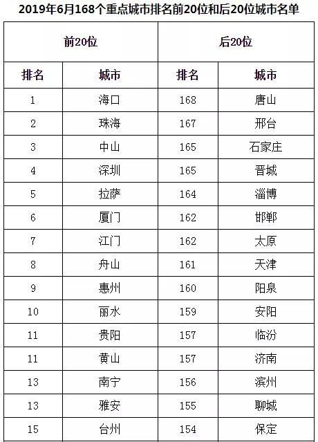 2019年6月,168個(gè)重點(diǎn)城市中唐山、邢臺(tái)、石家莊市等20個(gè)城市空氣質(zhì)量相對(duì)較差(從第168名到第149名);海口、珠海、中山市等20個(gè)城市空氣質(zhì)量相對(duì)較好(從第1名到第20名,見附表1)。
